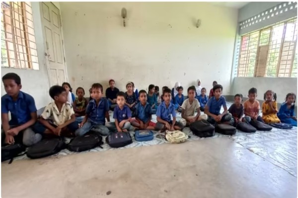 স্কুলে বেঞ্চের অভাব, তাই মেঝেতেই পাঠদান